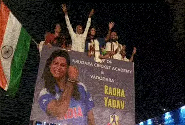 વર્લ્ડ કપ ચેમ્પિયન રાધા યાદવનું વડોદરામાં ભવ્ય સ્વાગત: ICC મહિલા ક્રિકેટ વર્લ્ડ કપ વિજેતા ભારતીય મહિલા ક્રિકેટ ટીમની ઓલરાઉન્ડર રાધા યાદવનું શનિવારે (8 નવેમ્બર) રાત્રે તેના વતન વડોદરામાં ભવ્ય સ્વાગત કરવામાં આવ્યું હતું. હરાણી એરપોર્ટથી શરૂ થયેલા રોડ શોમાં મોટી સંખ્યામાં ક્રિકેટ રસિકો, ચાહકો અને શહેરીજનો ઉમટી પડ્યા હતા, જાણે આખું શહેર પોતાની દીકરીના સન્માનમાં ઉમટી પડ્યું હતું.