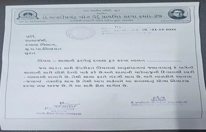 સુરત મહાનગરપાલિકાના લિંબાયત ઝોનના ભાટે વિસ્તારમાં આવેલી શિક્ષણ સમિતિની શાળા નં. 29 જે ડો. જગદીશચંદ્ર બોઝ ઉર્દૂ શાળા તરીકે ઓળખાય છે. જે તે શાળાના મુખ્ય શિક્ષક દ્વારા લિંબાયત ઝોનને પત્ર લખવામાં આવ્યો છે. આ પત્રમાં કહેવામાં આવ્યું છે કે લોકો અહીં સ્કૂલની સામે ટેમ્પો પાર્ક કરે છે. અને શાળાની ચારે બાજુ દિવાલ પરથી લારી-ગલ્લા મુકી દીધા હતા. જેથી શાળાની આસપાસ ગંદકી છે. અને બાળકોને આવવા-જવામાં તકલીફ પડે છે. તો આપને વિનંતી છે કે આ સમસ્યાને યોગ્ય રીતે હલ કરો. આ પત્રમાં શાળાની આસપાસ થતી હેરાનગતિના ફોટોગ્રાફ્સ છે.