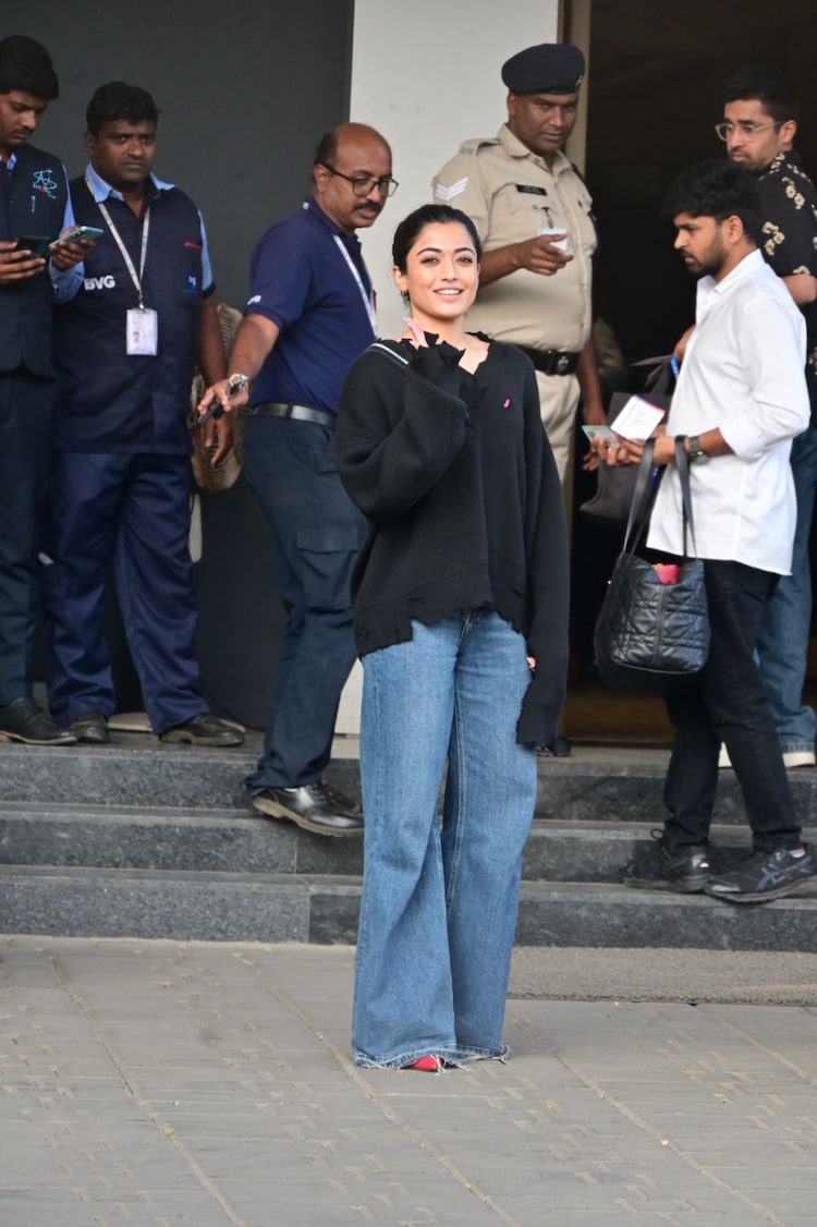 Rashmika Mandanna in casual outfit posed for pictures at Mumbai’s private airport while leaving for Hyderabad.