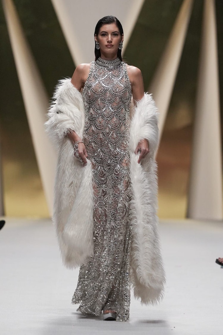 For this global showcase, Malhotra took a break from his signature flank bridal enclosure and instead presented an array of a silhouette inspired silhouette of Dubai. Think of gowns, caps, long jackets and abiis in a brilliant fabric adorned with heavy decorations.