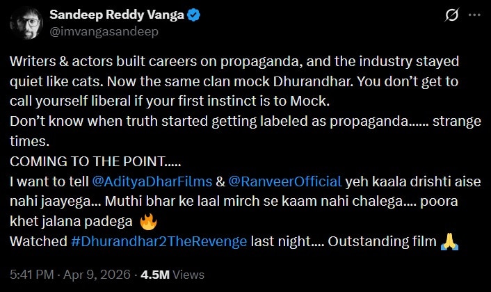 Earlier, Sandeep Reddy Vanga had posted about his criticism on X Dhurandhar 2: Revenge. He wrote, “Writers and actors built their careers on propaganda, and the industry remained silent like cats. Now the same clan makes fun of the bigots. You can’t call yourself a liberal if your first instinct is to make jokes. I don’t know when the truth started being labeled propaganda. Strange times.”
