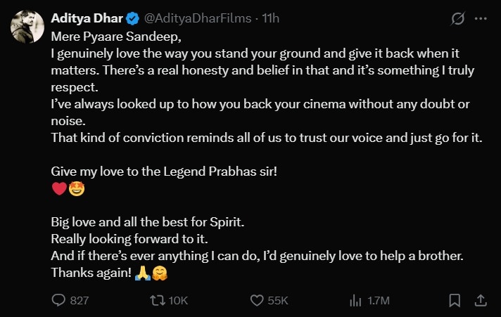 In his reply on X, Dhar praised Vanga’s stance. He wrote, “My dear Sandeep, I really like the way you present your point and respond when needed. There’s real honesty and trust in it, and that’s something I really respect.