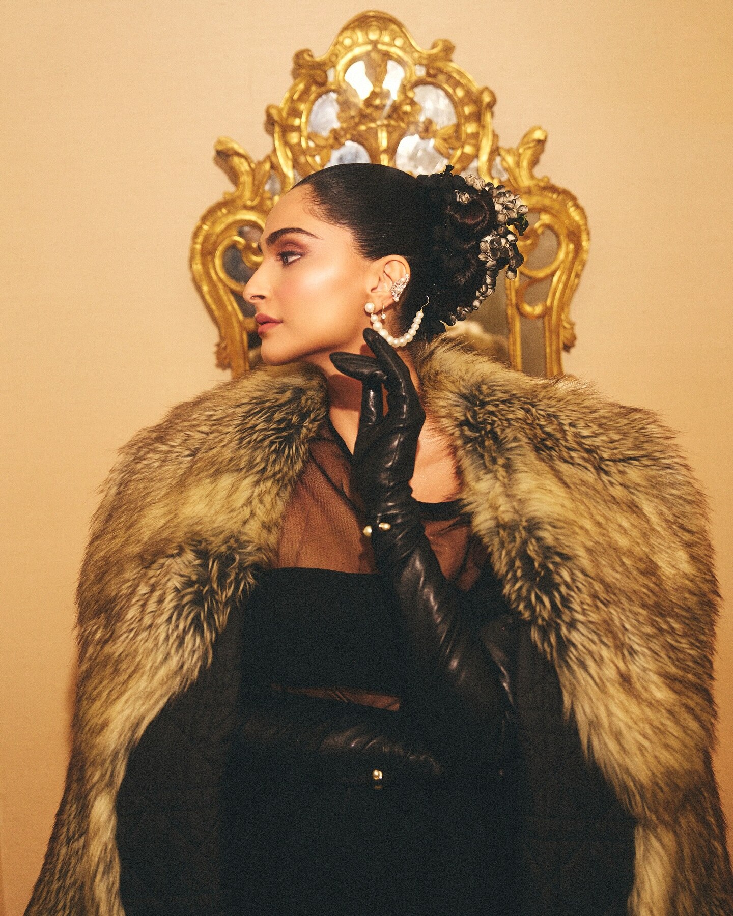 Sonam opted for a monochromatic look, which featured a liquid sheer dress and added it to the resort 2025 collection of the house with an impure fur coat. Of course, do not forget those long black gloves for an edgier finish. The look feels that she broadcast the elegance of Vintage Hollywood (somewhat reminds of the prestigious Audrey Hepburn. breakfast at Tiffany’s Look).