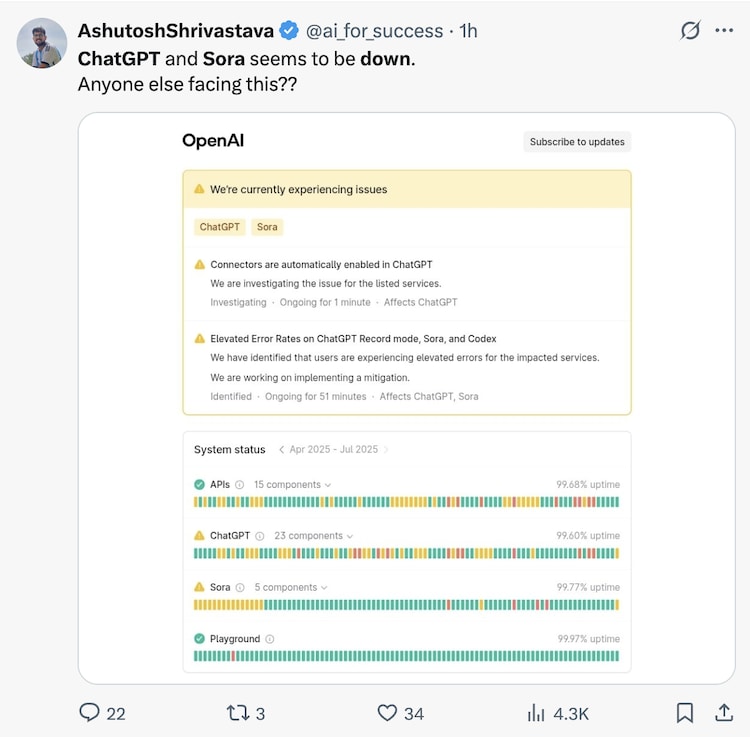 This is the second major outage for Openai in the last one month, which increases concerns between regular users and developers who rely on equipment for work and material production. India is affecting users worldwide, with India, parts of Asia and a significant amount of complaints from America and Europe.