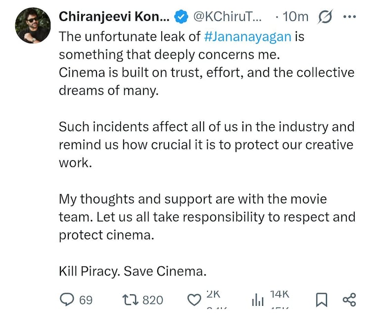 Chiranjeevi expressed disappointment Jan NayganThere is a leak on his X handle. His post read, “The unfortunate leak of #Jannanayagan is something that concerns me deeply. Cinema is built on faith, effort and the collective dreams of many people. Such incidents impact all of us in the industry and remind us how important it is to protect our creative works.”