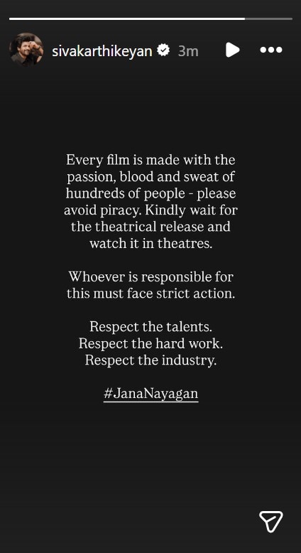 Actor Sivakarthikeyan expressed concern on his Instagram stories, emphasizing the effort behind filmmaking: “Every film is made with the passion, blood and sweat of hundreds of people – please avoid piracy. Please wait for the theatrical release and watch it in theatres. Whoever is responsible for this will face strict action. Respect the talent. Respect the hard work. Respect the industry…#Jannanayagan…(sic).”