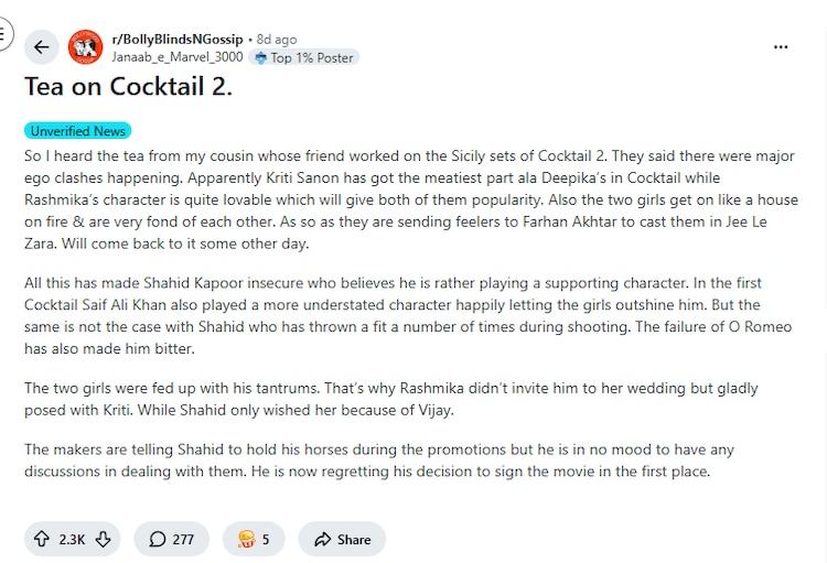 Now, the original post, which Bipasha shared on her Instagram, cites a Reddit discussion to suggest that Shahid Kapoor might be feeling a little insecure about his co-stars’ prominence in the sequel. Whispers have it that Kriti Sanon and Rashmika Mandanna have big roles, which has sparked discussion about Shahid’s reaction. Screenshots of Bipasha’s repost quickly went viral, being highlighted on Reddit threads and social media feeds alike.