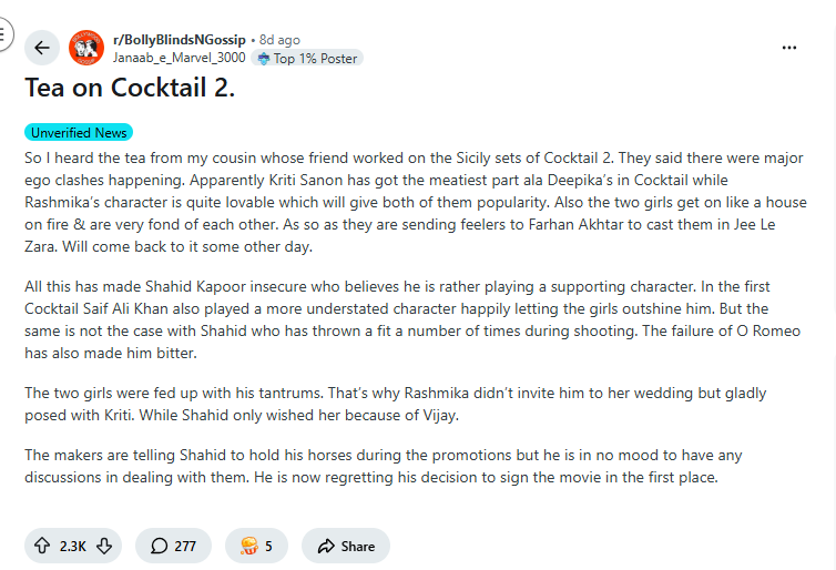 Now, the original post, which Bipasha shared on her Instagram, cites a Reddit discussion to suggest that Shahid Kapoor might be feeling a little insecure about his co-stars’ prominence in the sequel. Whispers have it that Kriti Sanon and Rashmika Mandanna have big roles, which has sparked discussion about Shahid’s reaction. Screenshots of Bipasha’s repost quickly went viral, being highlighted on Reddit threads and social media feeds alike.