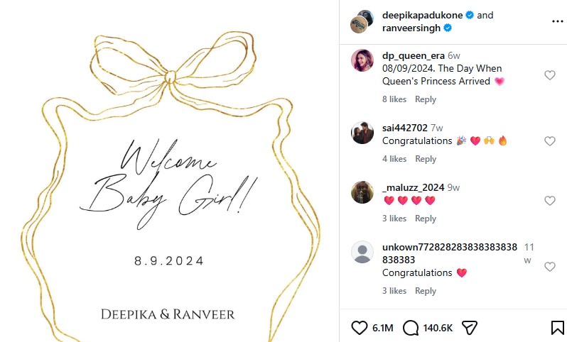 On September 8, 2024, Deepika and Ranveer had announced the birth of their first baby girl with an adorable post on Instagram. In a joint post, the couple wrote, “Welcome baby girl. 8-9-2024. Deepika and Ranveer (sic).”
