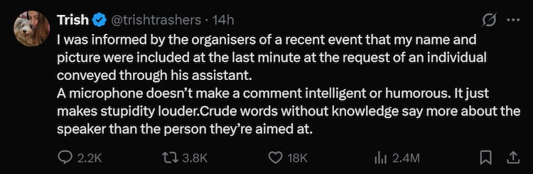 In her post, Trisha revealed that she was informed by the event organizers that her name and image were added to the program at the last hour, specifically at the request of a person through her assistant. Without naming Parthiban directly, he sharply criticized his conduct: