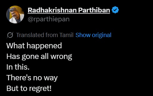 Following Trisha’s public rebuke and the subsequent reaction from internet users, Parthiban immediately issued an apology by sharing a voice note. Acknowledging that his attempt at humor missed the mark and caused real offense, he posted a brief note of regret on social media, saying, “What happened… is everything that went wrong. There is no way out but to repent!”