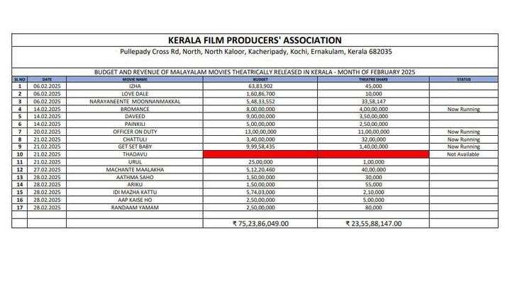 The report shared by KFPA shows that 17 films have been released in February. The total budget of these films is Rs 75.23 crore. However, collectively, these films have recorded a dramatic share of only Rs 23.55 crore. Comparing the budget and shares, it seems that there is a major threat in terms of box office performance.