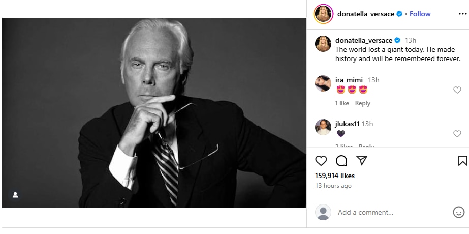 Italian fashion designer Donatella Versace made a dedicated post for the late icon and shared Armani’s simple black and white image by staring into the camera while wearing a silver suit. “The world lost a huge today. He made history and will be remembered forever (SIC),” he captioned the image.