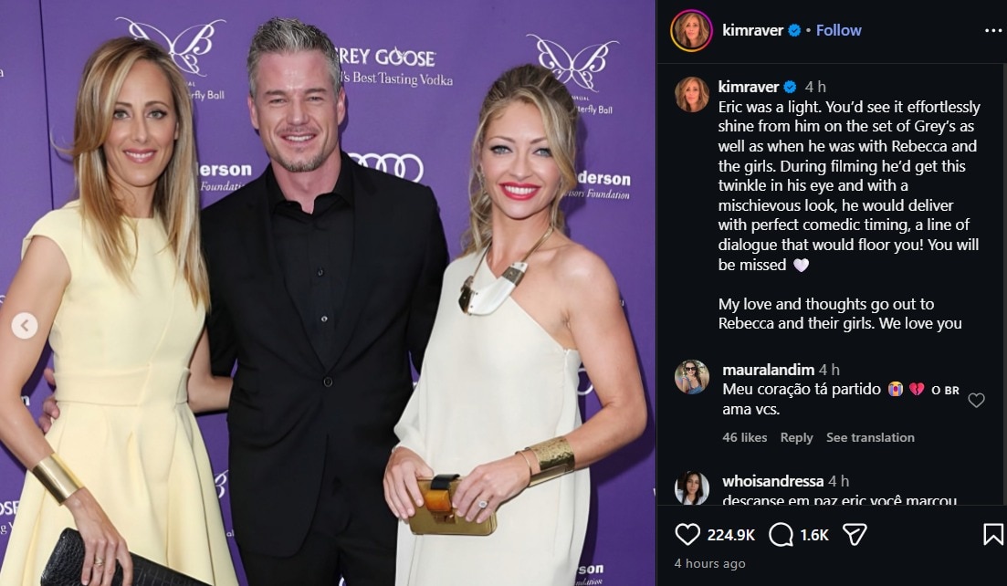 Actor Kim Raver, who played Dr. Teddy Altman on the show, described Dane as a source of light. “Eric was a light,” she said. “You would have seen him shine effortlessly on the set of Grey’s as well as when he was with Rebecca and the girls. With a mischievous look and perfect comedic timing, he could deliver a line that would hit you. You will be missed.”