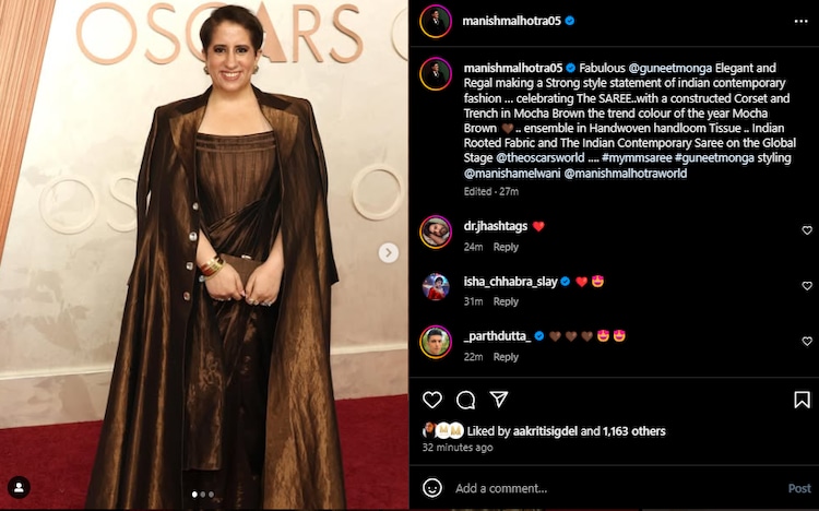 Gunite Monga wore a hand -woven tissue, including a corset, a sari drape, and a bejured overcoat by designer Manish Malhotra for the Oscar 2025.