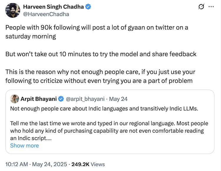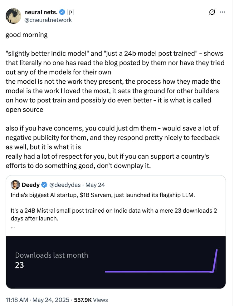 Another user, who works in AI4Bharat, said that the actual achievement was not just a model, but a method used to train it. He said that it sets a strong base for the construction of other Indian developers.