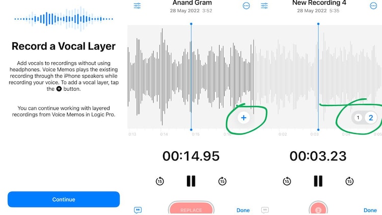 To use the feature, open the Voice Memos app on your phone. This is the audio recording app that comes pre-installed on iPhones. Then, tap any recording you already have on your phone, or a new recording of background score or instruments that you make. You’ll see a waveform icon at the bottom left of that particular recording. Tap on it. You will now see a new ‘+’ symbol on the screen. Tapping on it will add layers to your audio recording.