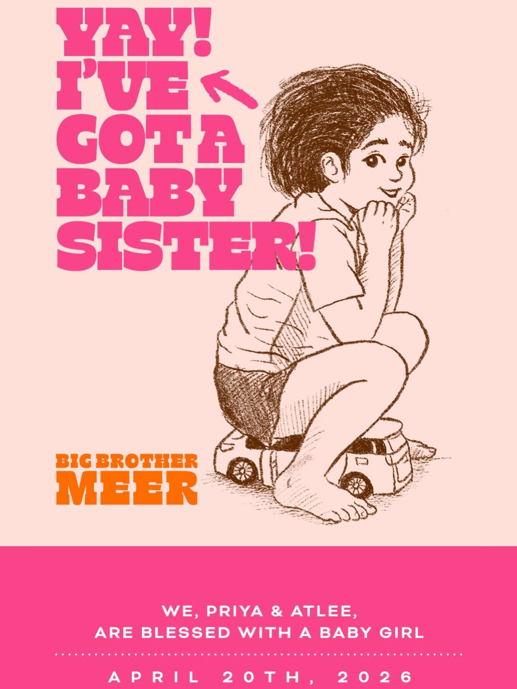 On Monday, Atlee shared a picture of a child sitting on his toy car, writing, “Big brother Mir. Yay! I’ve got a little sister! (sic).” Sharing the good news, Atlee wrote, “We, Priya and Atlee, have been blessed with a baby girl.” With date stamp of April 20, 2026.