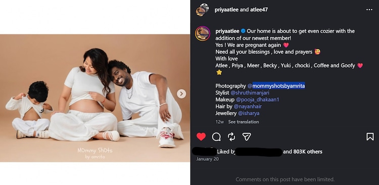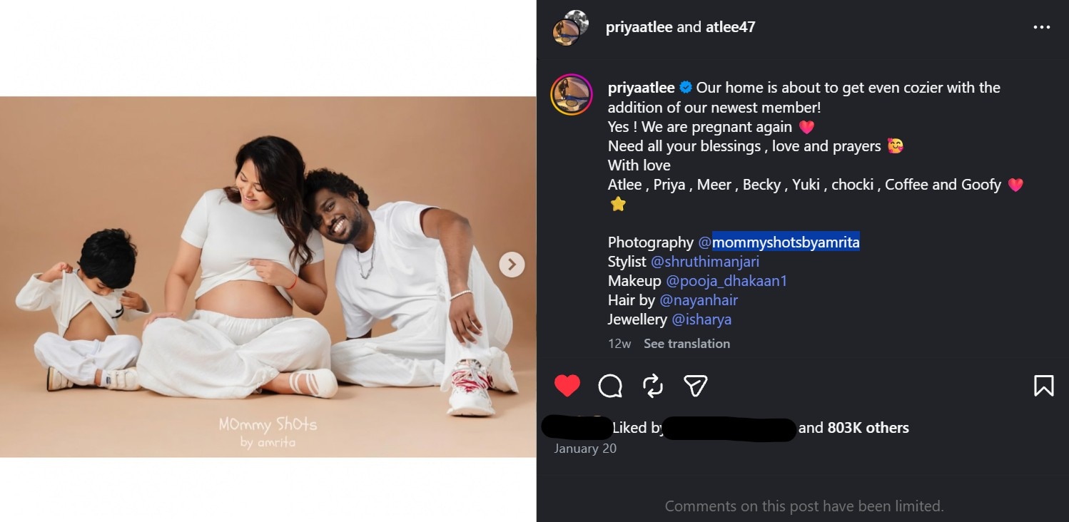 On January 20, the couple announced Priya’s second pregnancy with a series of pictures from her maternity photoshoot. The caption read, “Our home is about to get even cozier with the arrival of our new member! Yes! We are pregnant again. Need all your blessings, love and prayers. With love, Atlee, Priya, Mir, Becky, Yuki, Choki, Coffee and Goofy.”