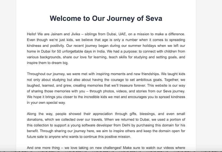 The domain now opens with an inspiring message from the siblings: “Hello! We are Jainam and Jeevika – brother-sister from Dubai, UAE, on a mission to make a difference. Even though we are just kids, we believe that age is just a number when it comes to spreading kindness and positivity. Our recent journey started during our summer holidays when we left our home in Dubai for 50 unforgettable days in India. Our goal was to: connect with kids from diverse backgrounds, share their love of learning, teach study and goal-setting skills, and inspire them to dream big.”