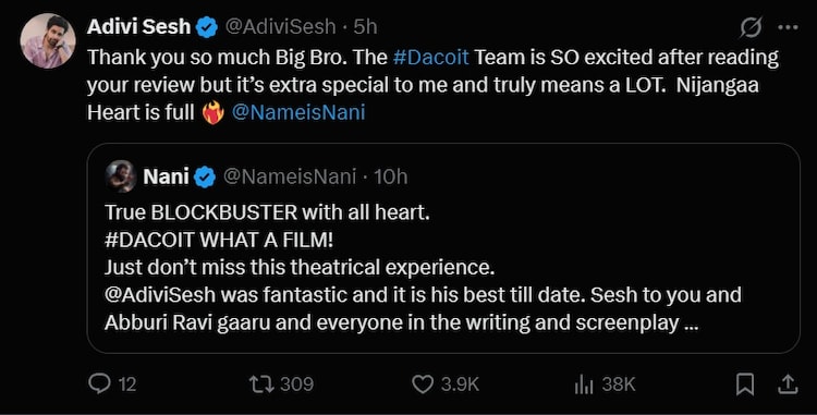 Responding to Nani’s post, Adivasi Shesh expressed his gratitude, writing, “Thank you so much Big Brother. The #Dacait team is so excited after reading your review, but this is very special to me and really means a lot. Njanga heart is full.”