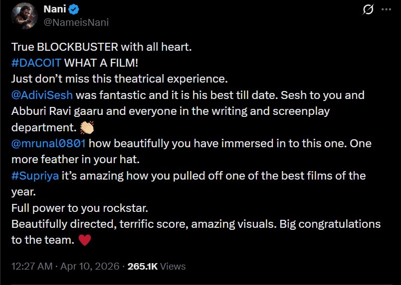 Telugu actor Nani has described Adivi Shesh’s performance in the romantic thriller Dacoit as his best work till date. Released worldwide on April 10, 2026, the film is creating excitement among the audiences due to its entertaining story and strong emotional narrative.