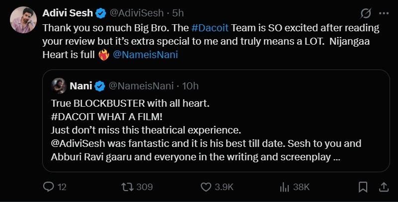 Responding to Nani’s post, Adivasi Shesh expressed his gratitude, writing, “Thank you so much Big Brother. The #Dacait team is so excited after reading your review, but this is very special to me and really means a lot. Njanga heart is full.”