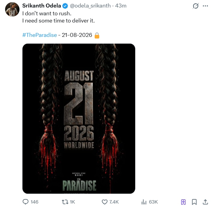 Director Srikanth Odela shared the update on social media along with a new poster, writing, “I don’t want to rush. I need some time to present it.” The new release date of the film was mentioned in the post as August 21, 2026.