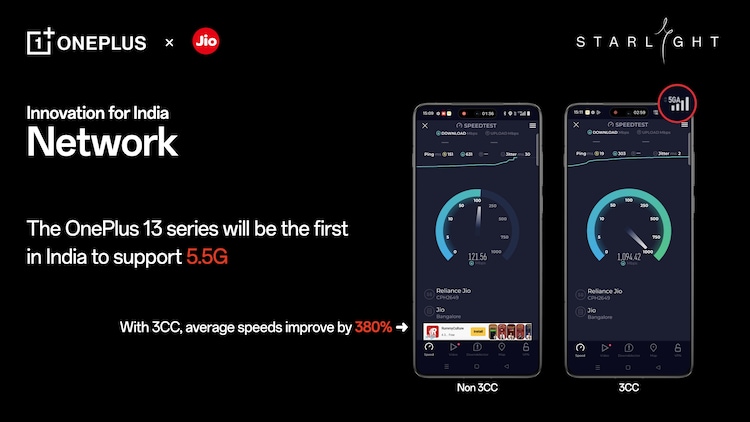 Meanwhile, the upcoming OnePlus 13 is also going to benefit from Project Starlight. Specifically, OnePlus highlights some of the features that the OnePlus 13 will bring to Indian users. One of these is support for 5.5G networks, which is an advanced version of standard 5G. For the OnePlus 13, the company has already tested 5.5G network support in partnership with Jio in Bengaluru and achieved speeds of up to 1Gbps. The company says this will be possible because the OnePlus 13 will be able to use and combine cellular connectivity from 3 towers simultaneously.