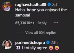 Raghav commented, “Haha, hope you enjoyed Samosa!” After the influencer requested Parineeti to respond, she wrote, “@parineetichopra Madam, you also accept it now, Sir has got a huge fan following here. (Parineeti ma’am hope you also accept it, sir has a huge fan following here)” – The actor, reacting to her husband being called handsome, said, “(eyes emoji) I completely agree (nervous laughing emoji).
