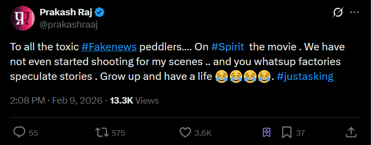 Actor Prakash Raj has dismissed reports claiming that he has been removed from the post. SoulUpcoming action drama directed by Sandeep Reddy Vanga and starring Prabhas. This clarification comes in the wake of rumors on social media that he is no longer a part of the film following differences between the actor and the director.