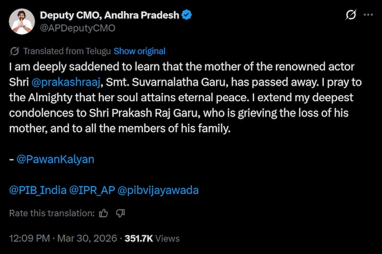 Pawan Kalyan wrote, “I am deeply saddened to learn that Smt. Suvarnalatha Garu, mother of the famous actor Shri @PrakashRaj, has passed away. I pray to God that her soul rests in eternal peace. I express my deepest condolences to Shri Prakash Raj Garu, who is saddened by the demise of his mother, and all his family members.”
