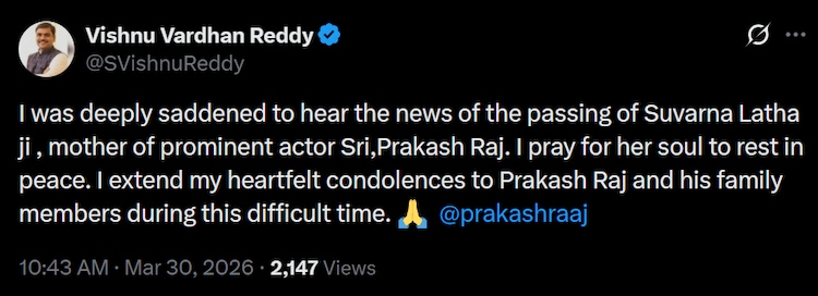 Former member of the Legislative Assembly Vishnu Vardhan Reddy also expressed his sympathies, writing, “I am deeply saddened to hear the news of the demise of Suvarna Latha ji, mother of leading actor Shri Prakash Raj. I pray for the peace of her soul. I express my heartfelt condolences to Prakash Raj and his family members during this difficult time.”