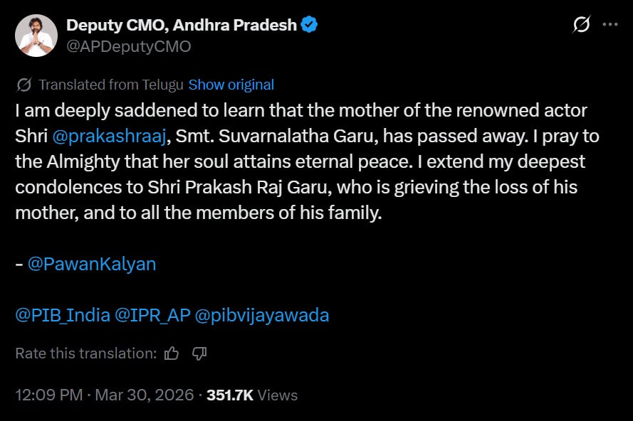 Pawan Kalyan wrote, “I am deeply saddened to learn that Smt. Suvarnalatha Garu, mother of the famous actor Shri @PrakashRaj, has passed away. I pray to God that her soul rests in eternal peace. I express my deepest condolences to Shri Prakash Raj Garu, who is saddened by the demise of his mother, and all his family members.”