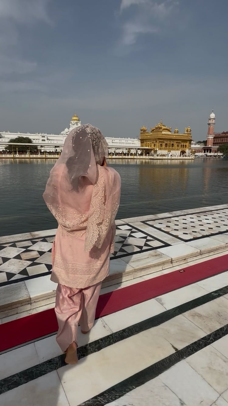 Another picture shows the actor looking across the calm waters towards the shimmering Golden Temple. Dressed in a light pink traditional outfit with delicate embroidery, Chopra covered her head with a matching dupatta, blending seamlessly with the purity of the surroundings.