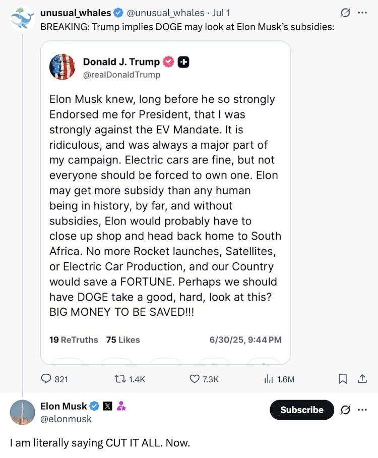On 30 June, Donald Trump, through his true social platform, launched a sharp attack on Elon Musk, suggesting that Kasturi credited his commercial success for government handouts. Trump wrote that Musk can “get more subsidy than any human in history,” and without those subsidies, Musk will have to go back home to South Africa. “
