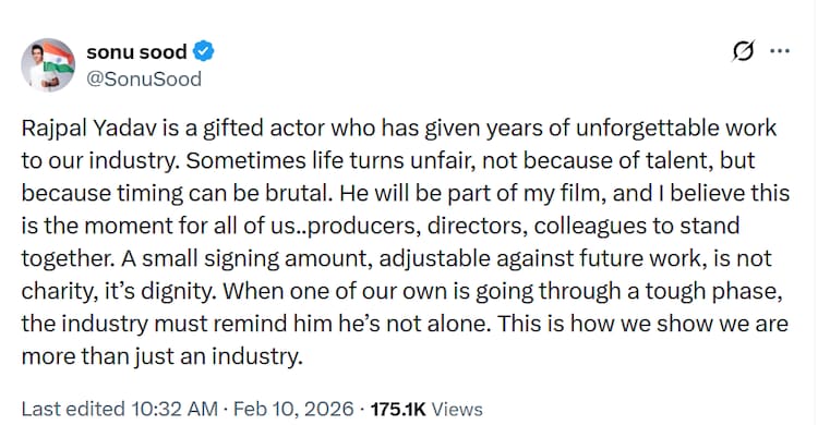 On Tuesday, actor and philanthropist Sonu Sood shared a long note on social media, urging members of the film industry to come forward in support of actor Rajpal Yadav, who is currently serving a six-month jail sentence in a check-bounce case. Sonu appealed to producers and directors to give Yadav a “signing amount” – not as a donation, but as a respectable way of helping him deal with the situation.