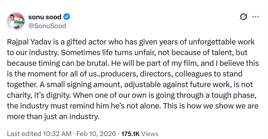 On Tuesday, actor and philanthropist Sonu Sood shared a long note on social media, urging members of the film industry to come forward in support of actor Rajpal Yadav, who is currently serving a six-month jail sentence in a check-bounce case. Sonu appealed to producers and directors to give Yadav a “signing amount” – not as a donation, but as a respectable way of helping him deal with the situation.
