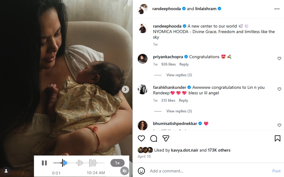 Bollywood actor Randeep Hooda and his wife Lynne Laishram welcomed their first child, a baby girl, in March 2026, and shared heartwarming glimpses of their new journey as parents. The couple introduced their daughter Nyomika to fans via social media, and offered up sweet moments from their everyday life.