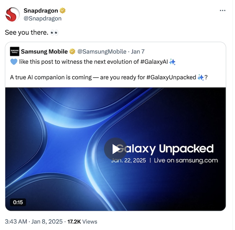 All models are believed to be powered by the Qualcomm Snapdragon 8 Elite chip. This was also hinted at in a tweet posted by Snapdragon, which was a response to the announcement at Samsung’s Galaxy Unpacked event. The post read: “See you there”.