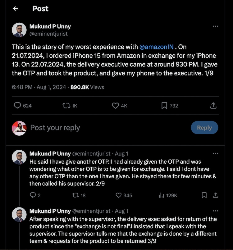 Unni detailed this disturbing experience in a series of tweets, shedding light on the scam. After the delivery executive handed over the new iPhone 15 and Unni provided the required OTP, he handed over his old iPhone 13. Surprisingly, the executive then demanded another OTP, claiming it was required for the exchange process. Unni, shocked, said he had no additional OTP to provide.