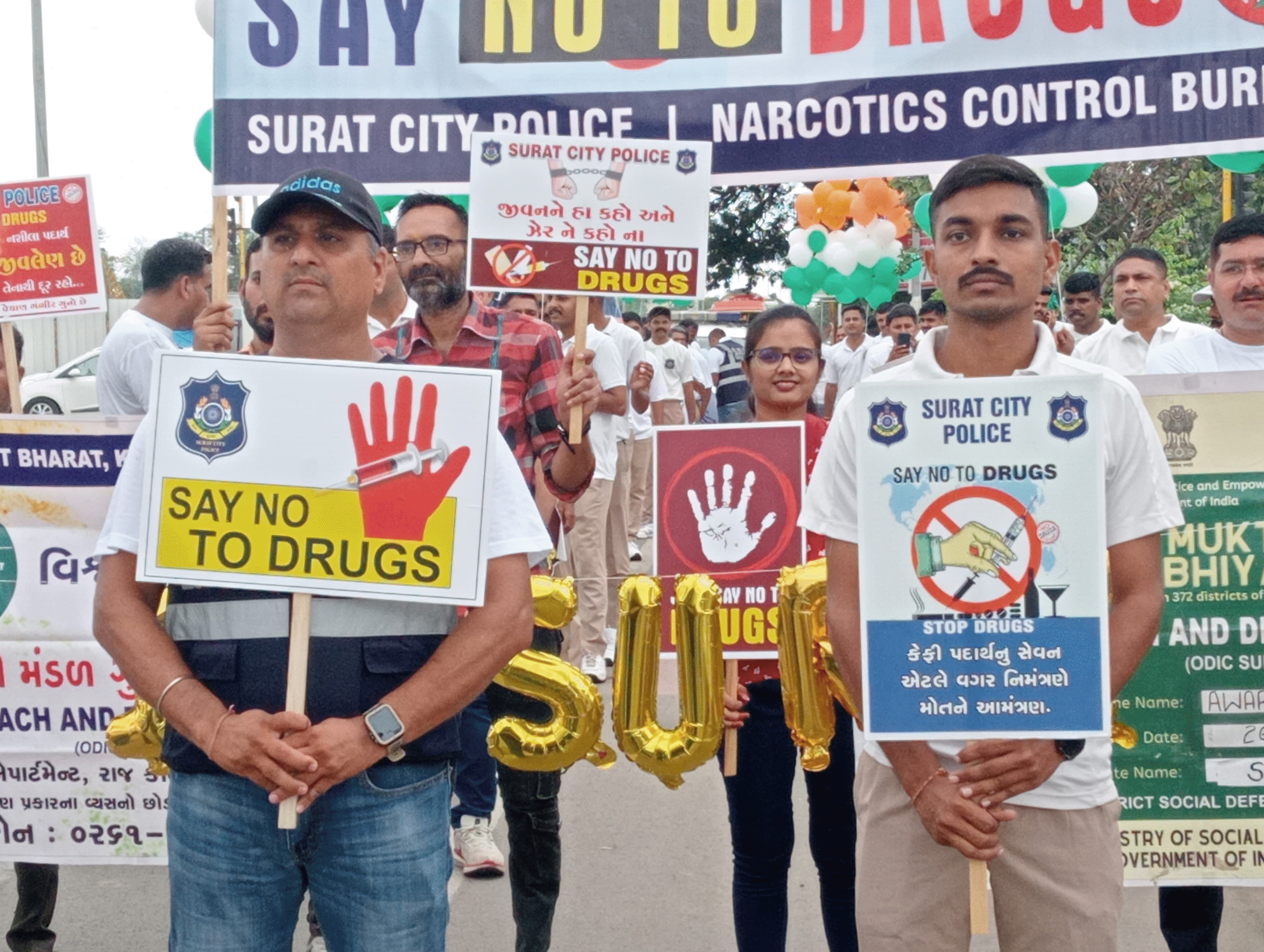 Surat ના પાલ RTO રોડ પાર એસઓજી પોલીસે દ્વારા વિવિધ સ્લોગન સાથે ના પોસ્ટરો રજુ કરી ડ્રગ્સ વિરોધ અભિયાન સ્વરૂપે રેલી યોજવામાં આવી હતી રેલી દ્વારા ડ્રગ્સથી દૂર રહેવામાં જનજાગૃતિ કેળવવામાં આવી હતી .