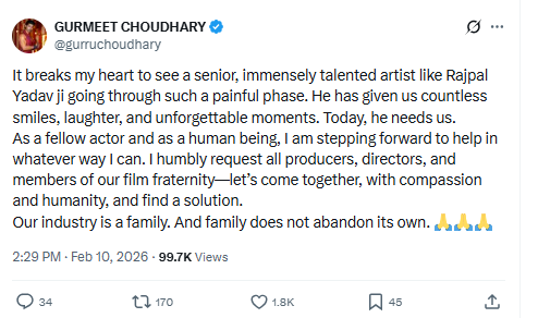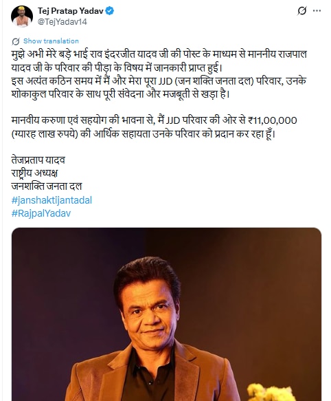 Tej Pratap Yadav expressed solidarity with the actor’s family after learning about the situation through a post from his elder brother Inderjeet Yadav. He said, “I just came to know about the grief and suffering of Rajpal Yadav ji’s family through a post by my elder brother Rao Inderjit Yadav ji. In this extremely difficult time, I and the entire JJD (Jan Shakti Janata Dal) family stand firmly with the bereaved family with our deepest condolences and solidarity.”