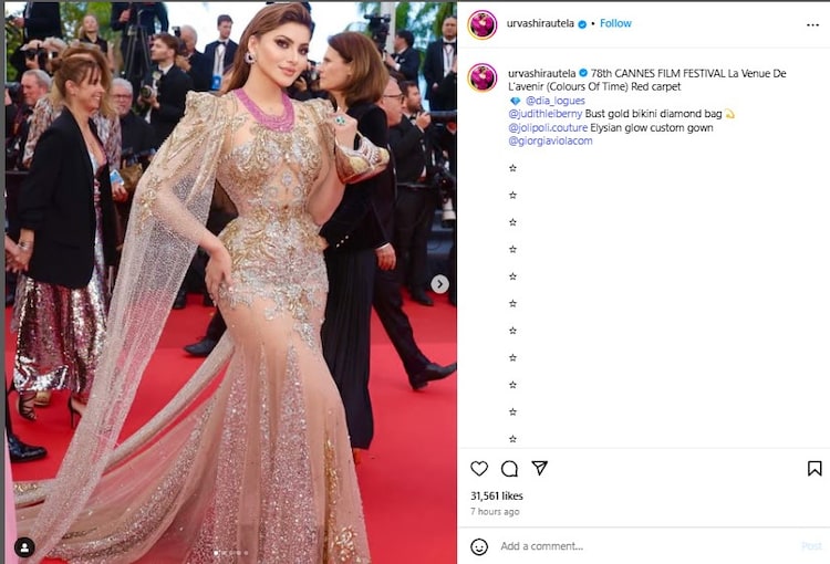 Actor Urvashi Rautela once again made headlines with her fashion sense at the Cannes Film Festival. After her striking and bold appearance first, Rautela shocked fans in a golden ornate gown. However, it was his clutch again who spoke.
