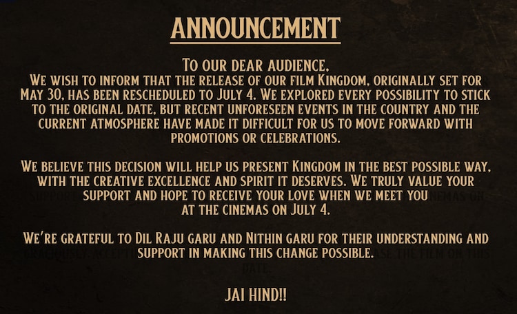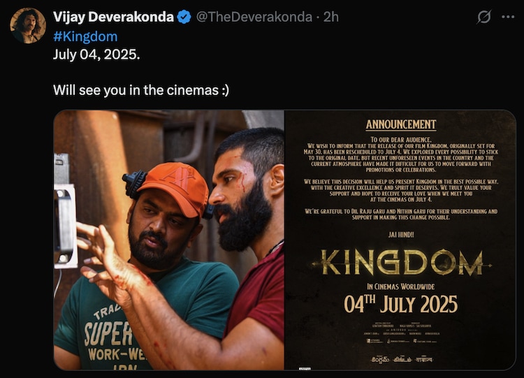 Actor Vijay Devarakonda shared an update on X, with a note caption, “#Kingdom, July 04, 2025. In the note, the manufacturers mentioned,” We want to inform that our film ‘Kingdom’ is released, originally set for 30 May, resolved on 4 July. “
