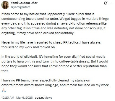 Actress Yami Gautam has clarified her involvement after social media users ‘liked’ an Instagram reel criticizing Kriti Sanon’s Best Actress win at an awards show. He claimed that his actions were unintentional.